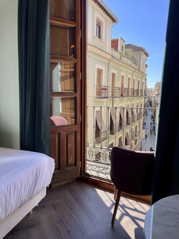 We hadden een hotel geboekt in het centrum van Granada https://honestgranadahotel.com. Dit hotel ligt midden in een winkelstraat te liggen met restaurants, café’s en winkeltjes vlakbij. Als je een kamer hebt aan de voorkant, dan kan je in de middag in het voorjaarszonnetje zitten voor de openslaande deuren.